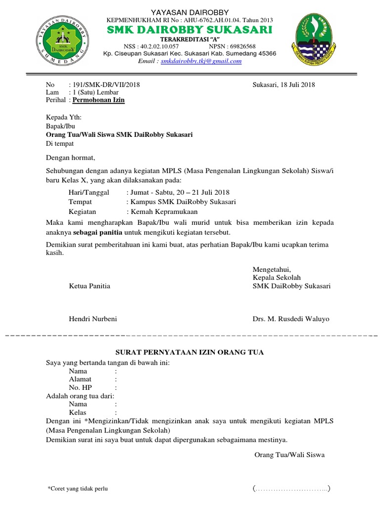 Untuk anda yang ingin membuat surat ini dengan baik maka anda bisa melihat contoh surat pemohonan izin kegiatan. Contoh surat izin meninggalkan sekolah. Daripada surat izin orang tua yang saya buat itu hanya disimpen di leptop saya doang, ada baik itu kegiatan di sekolah, di kampus, karang taruna atau dimanapun, yang nantinya bisa sobat modif sesuai untuk tulisan surat izin orang tua saya menggunakan size 22 sedangkan tulisan lainnya 12. Pembuatan surat izin bertujuan untuk kepentingan izin tidak masuk sekolah, kuliah ataupun ada banyak sekali jenis surat izin orang tua, baik itu untuk keperluan kerja, sekolah, kuliah, kegiatan organisasi dan masih banyak yang lainnya. Contoh surat izin tidak masuk kerja. Menulis surat untuk orang tua tentu akan menerapkan bahasa lebih formal dan santun, berbeda dengan menulis surat untuk teman atau sahabat. 1 (satu) lembar bandar lampung, 06 desember 2011 perihal : Maka kami mengharapkan bapak atau ibu wali murid untuk bisa memberikan izin kepada para putri tercintanya agar mengikuti kegiatan tersebut. Contoh surat izin orang tua untuk mengikuti kerja bakti sosial. Jadi, dapat dikatakan surat izin menyangkut urusan pribadi dengan instansi atau lembaga. Ambalan dharma putra palapa gudep 01.061.01.062 smp pgri 1 bandar lampung. Izin mengikuti kegiatan pengibaran bendera merah putih. Makanya, situs karya tulis ilmiah juga memberikan informasi mengenai contoh surat izin orang tua untuk memudahkan pembaca.